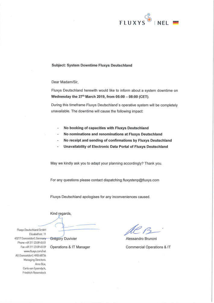 Fluxys Deutschland operative System Downtime on 27 March 2019