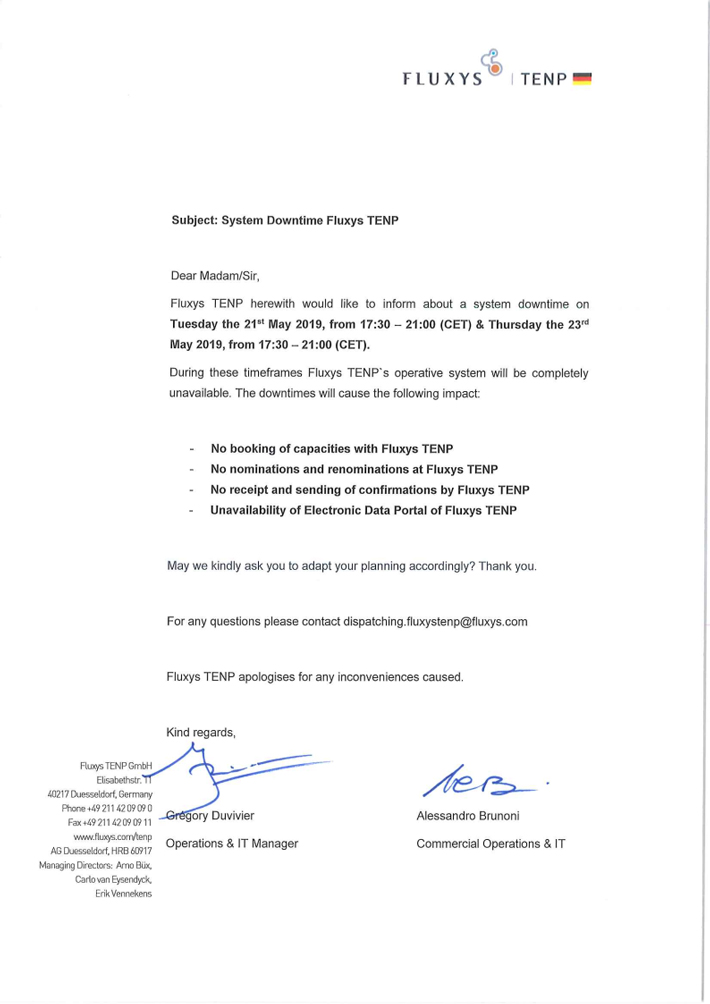Fluxys TENP operative System Downtime on 21. And 23. May 2019
