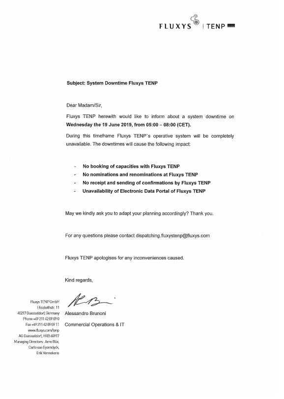 Fluxys TENP operative System Downtime on 19 June 2019